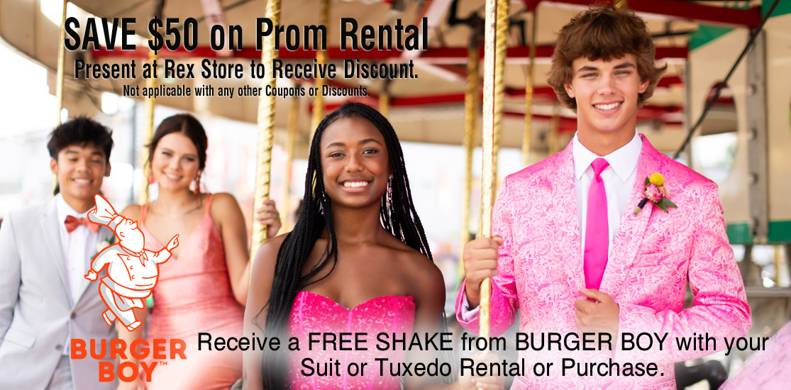 Click the button below and present that page to Rex on your cell phone to save $50 on your Prom Tuxedo or Suit Rental!